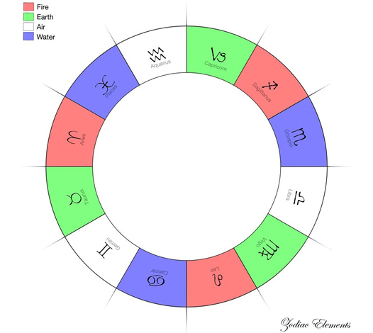 例えば「地の星座」に天体が多く、「火の星座」にはゼロ。自分でも生きる意義が見つけられず悶々とするという場合、「風の星座」の客観的な観察力、または「水の星座」が司る人の声なき声を心の耳で聞く感受性、こういったことを意識して身につけて、その上で「火の星座」、つまり表面のよしあしでものごとを観ずに、その背後にある哲学的で霊的な意義を自分で見つけ出す取り組みに向き合うべきです。