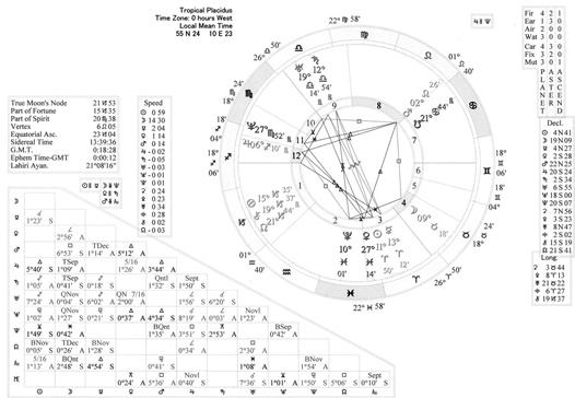 When he lost his father at the age of eleven, transiting Chiron was right on his natal Pluto (Pisces, the 2nd house) and sextile to the natal Moon (Taurus, the 4th house). He may have been thrown into the deeper and darker psyche though he was too young to digest the experience.